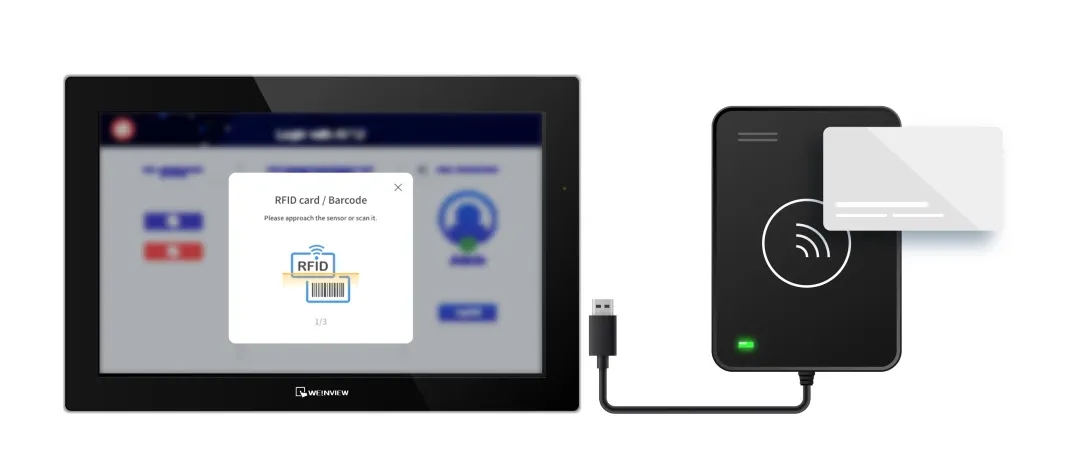 威綸通HMI通過USB連接RFID刷卡機,實現(xiàn)RFID刷卡身份驗證功能。用戶只需刷卡,即可快速登錄人機系統(tǒng),整個過程只需幾秒鐘的時間,極大地加速了身份驗證流程。此外,企業(yè)還可以結(jié)合現(xiàn)有的門禁卡、識別證、工牌等相關(guān)證件,使管理更加簡易。