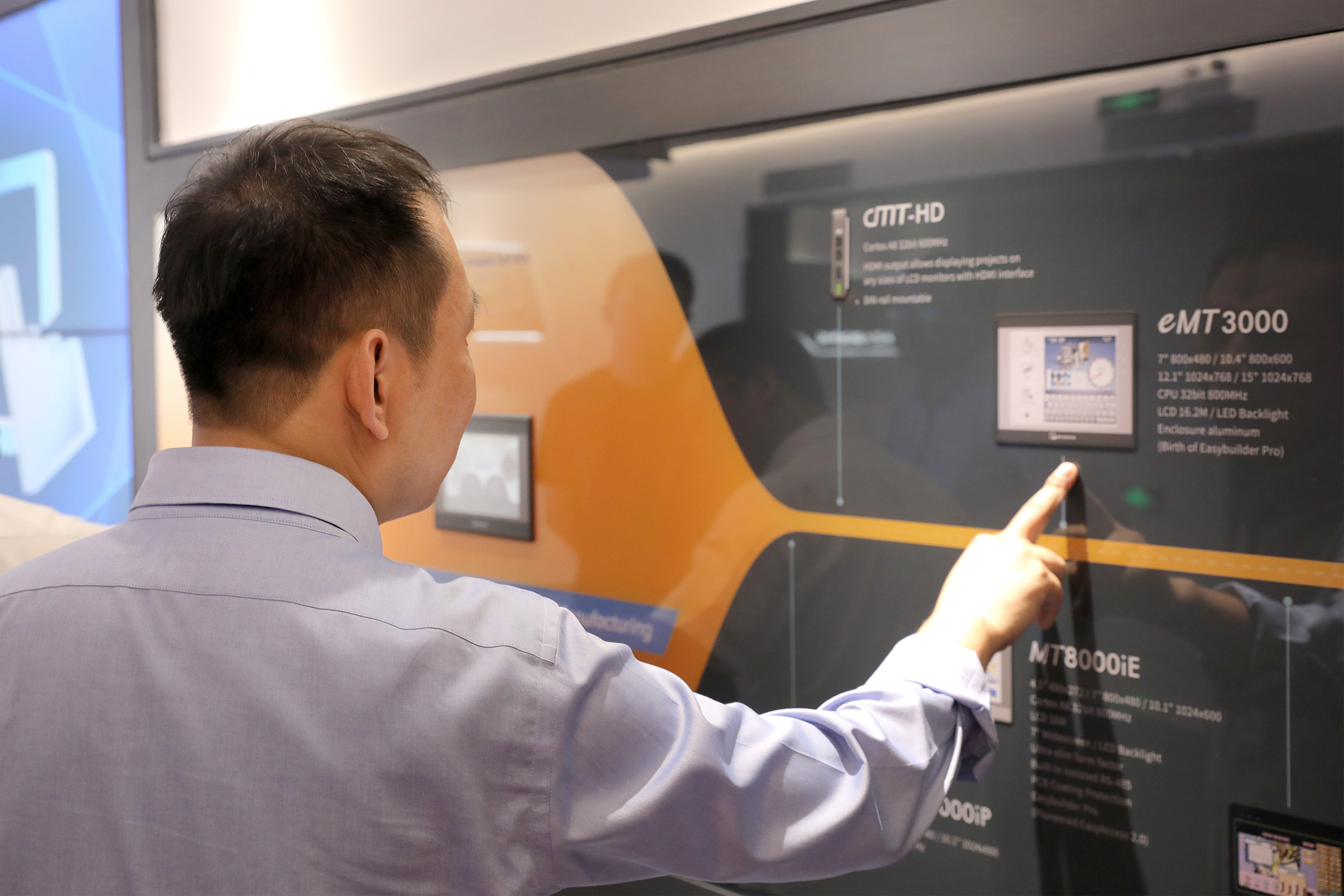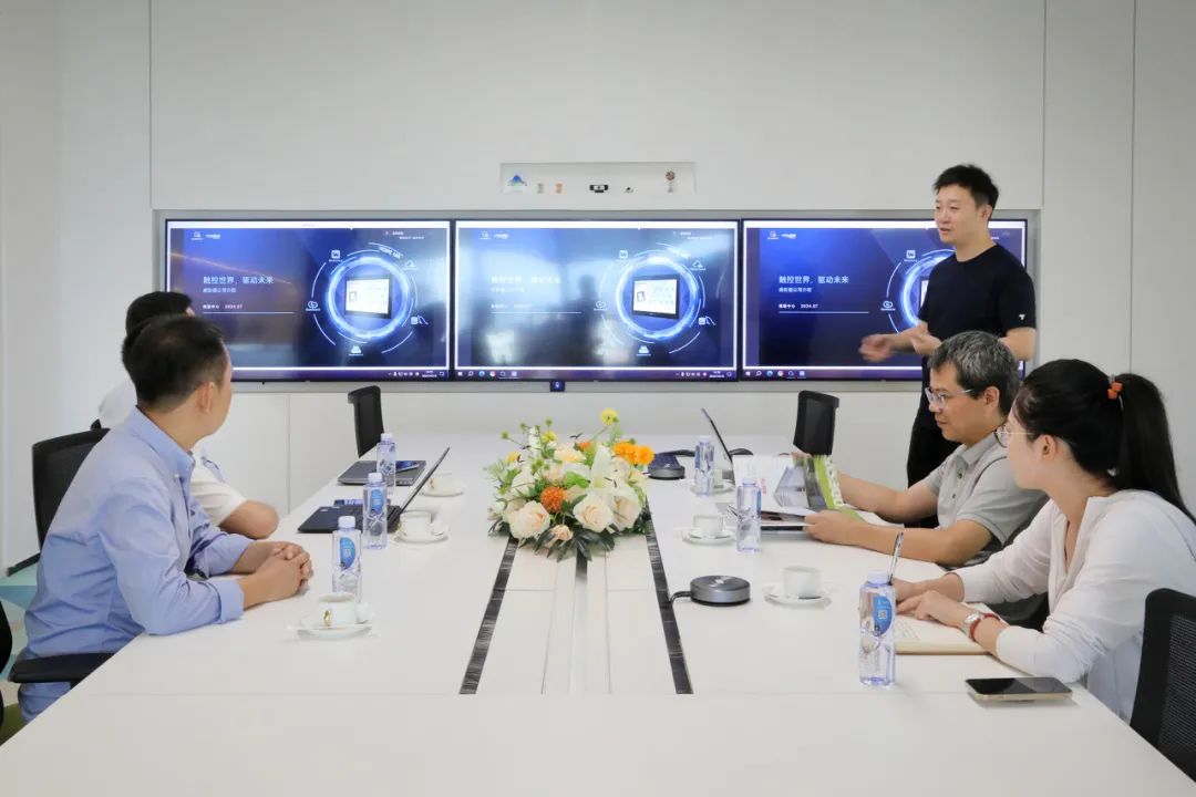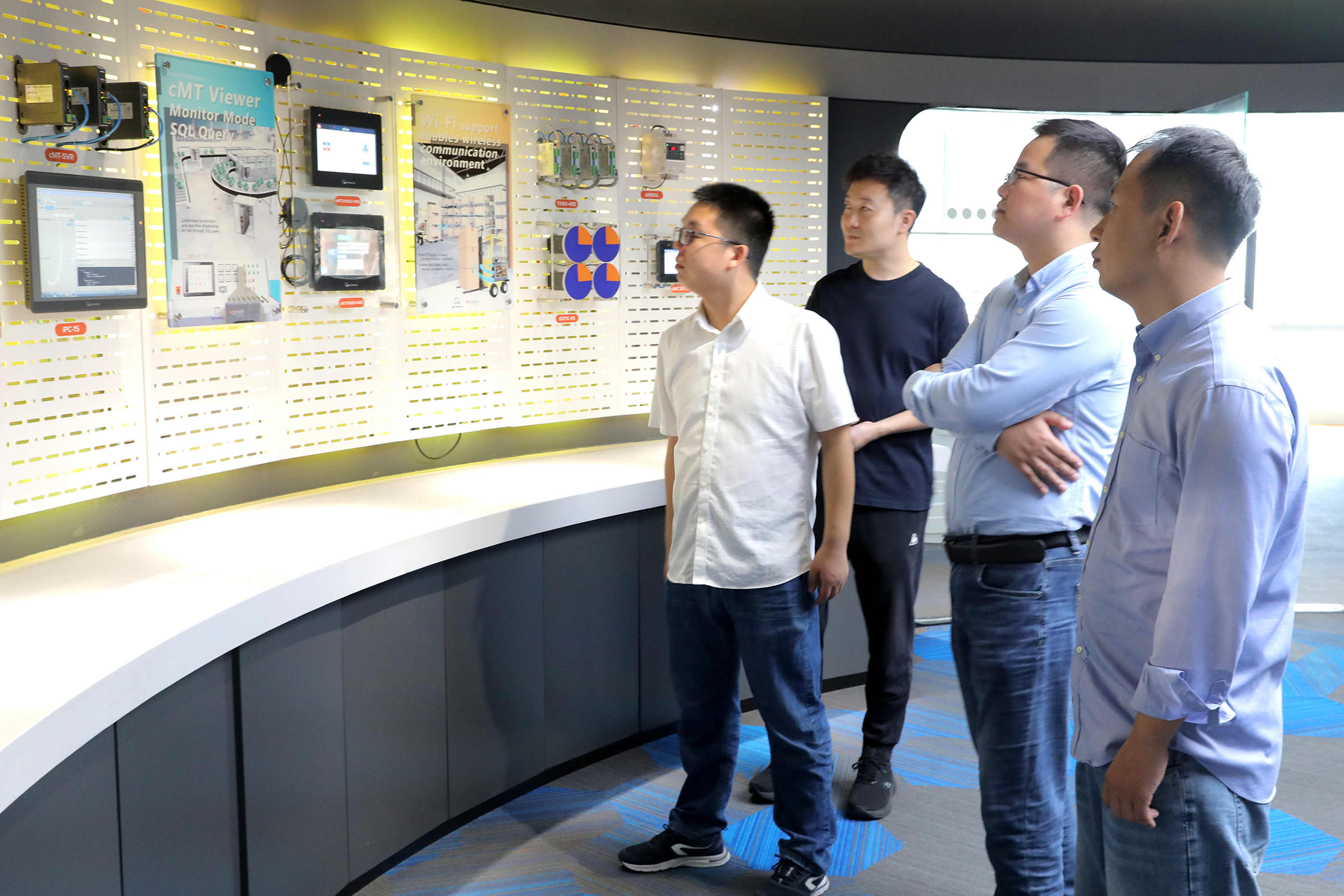 參觀過程中,劉成林向來訪領(lǐng)導(dǎo)介紹了威綸通企業(yè)發(fā)展歷程以及新一代cMT X系列云端監(jiān)控HMI產(chǎn)品,通過現(xiàn)場演示與互動體驗,展示威綸通完全運用自主控制系統(tǒng)(HMI+I/O)結(jié)合CODESYS軟PLC方案實現(xiàn)的對現(xiàn)場能源管理、照明、空調(diào)、窗簾、電源、音響等設(shè)備進行管理的自動化智能辦公系統(tǒng)。讓HMI與CODESYS相結(jié)合的優(yōu)勢展露無余。CODESYS(歐德神思)對威綸通的創(chuàng)新能力和研發(fā)實力給予了高度的認(rèn)可。